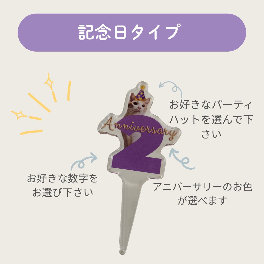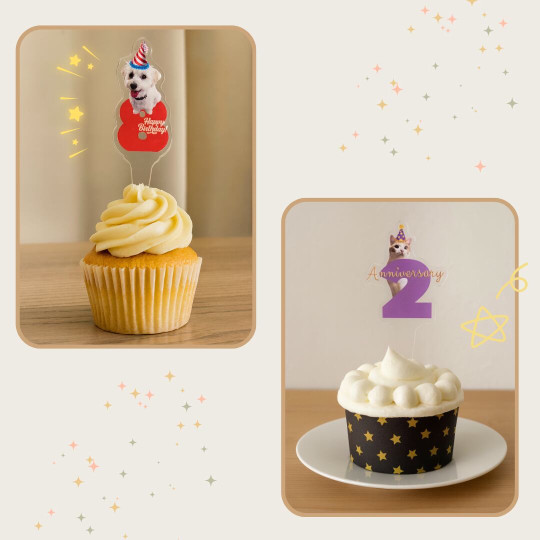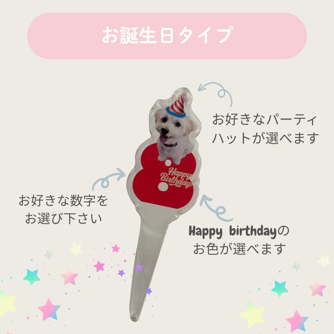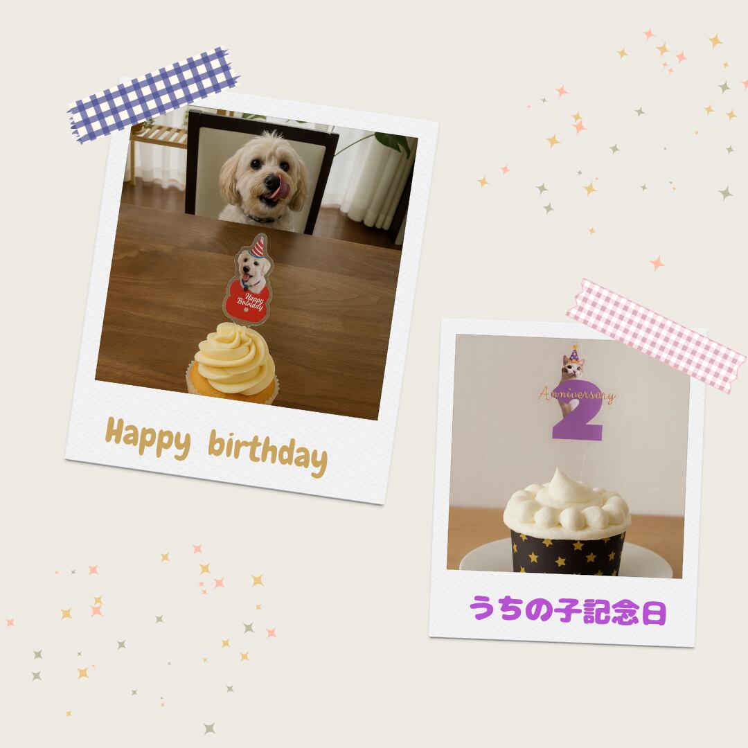 ペットのお写真をもとにデザインした、世界にひとつの”うちの子”ケーキピックです。パーティーハットをかぶったうちの子が、ケーキからひょっこりのぞく姿は、見るだけで笑顔に♡